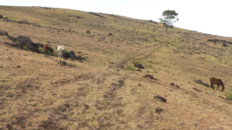 Although wooden fences have been erected around some of the moai lying further away, the destruction caused by hooves was obvious. Many were nearly flat against the ground.