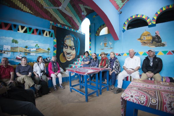The boat took us further along the Nile. The itinerary had mentioned a stop at a Nubian village to learn about their way of life. I had expected this to be something local and low key. What we actually experienced was tourism writ large. The usual stalls pushing cheap wares lined the streets, cars and motorbikes blared past, and the traditional houses had been turned into places offering drinks. We entered one, and our guide explained that the floors were deliberately lined with sand so snakes could be traced and removed.