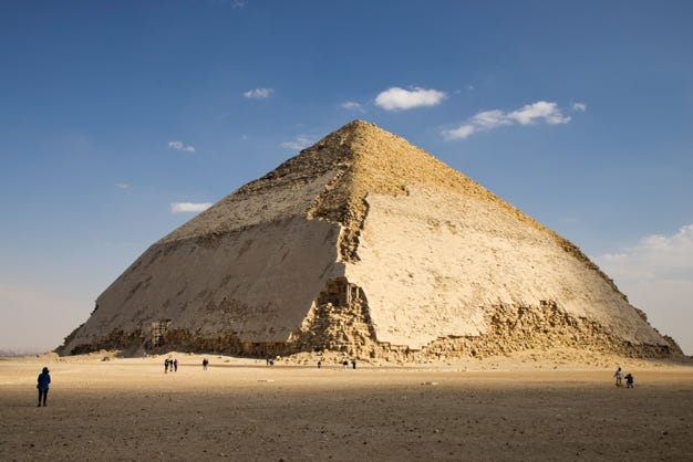 The next pyramid was called ‘The Rose Pyramid’ as it was built out of pink stone. Nearby was the ‘Bent Pyramid’, an early attempt which had partially collapsed. However the limestone cladding which all pyramids would have had, and had been removed from most of them, still clung to the sides.