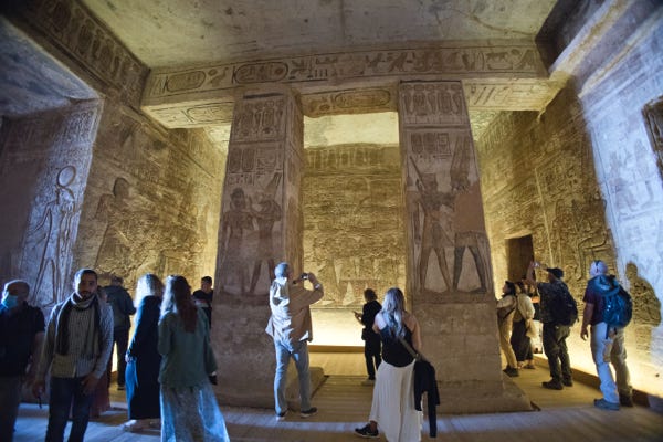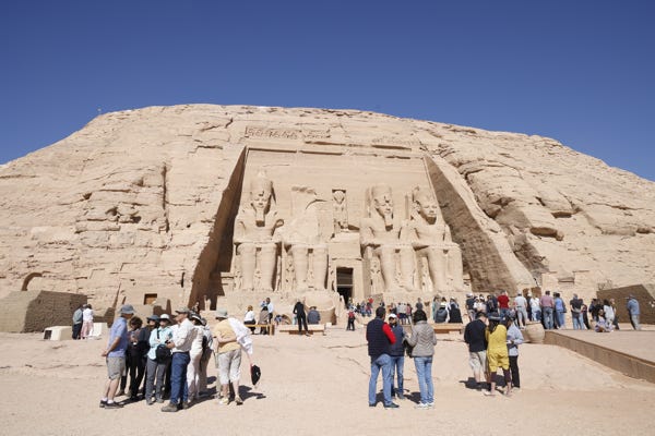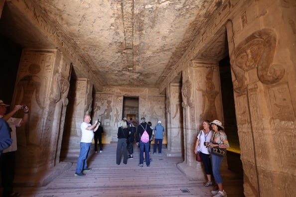The guide had a series of photographs, which he used to explain what I’d see inside the temple, as guides are required to remain outside. Ramesses II wanted to be regarded as a god in his lifetime, and the temple was part of his propaganda effort. Early on in the drawings, he stands lower than the gods and has sandals on his feet. Later, he stands at their level and is barefoot—gods don’t need shoes as they’re in paradise.