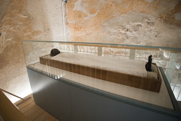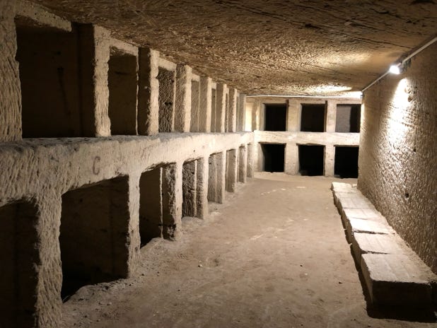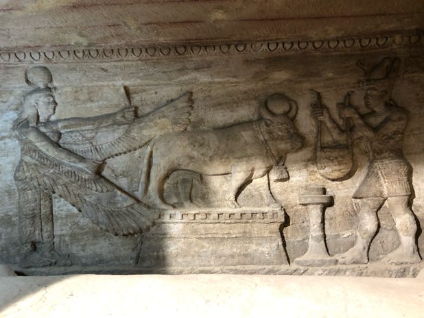 A spiral staircase took us down into the catacombs. The series of tombs had been filled with water, which meant no human remains had survived. But the niches for the nobles were quite intact, the carvings a mixture of Roman and Egyptian mythology. The servants had been laid to rest in less intricate tombs down side passages. Another room held horse bones. The best race horses were mummified and buried in the catacombs.