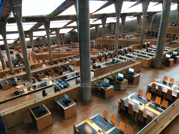 Alexandria is famous for the library which had once stood in the city, sadly destroyed centuries ago. A new library, the Bibliotheca Alexandrina, was built in 2002. After lunch at a café, we had a tour of the modern complex. The library is open to all for use, holding both physical and digital books. Old printing presses are on display. The roof structure was designed to look like eyes, and to provide plenty of natural light. Several art displays and small museums filled the lower section. Again no cameras allowed.