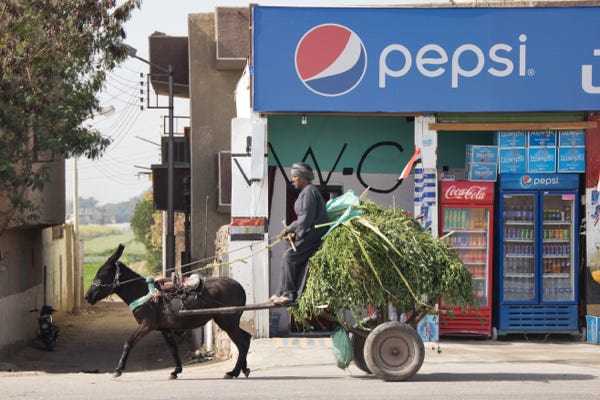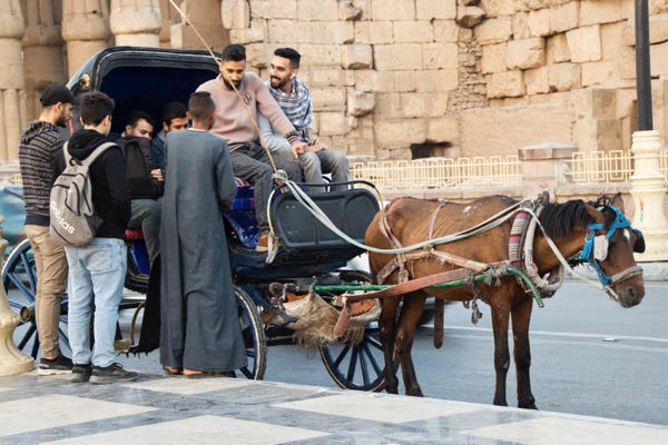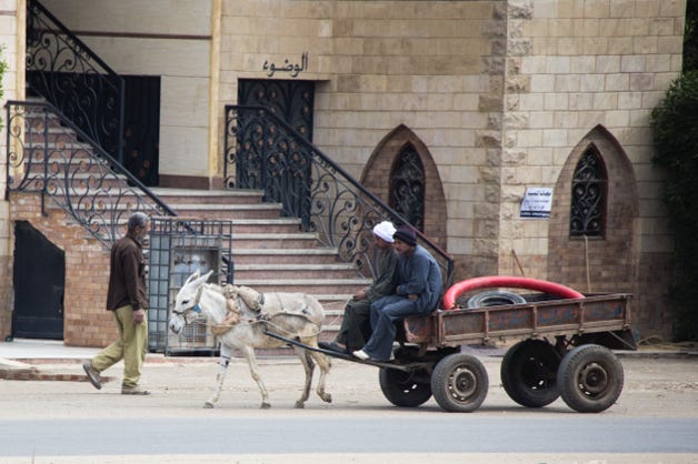 An hour later we disembarked. Our coach took us first to look at the Colossi of Memnon. These large statues, of the Pharoah Amenhotep III, have stood since 1350 BCE. The local stall holders did their best to interest us in their wares. I photographed a donkey cart trotting past.