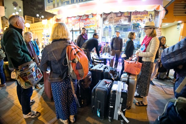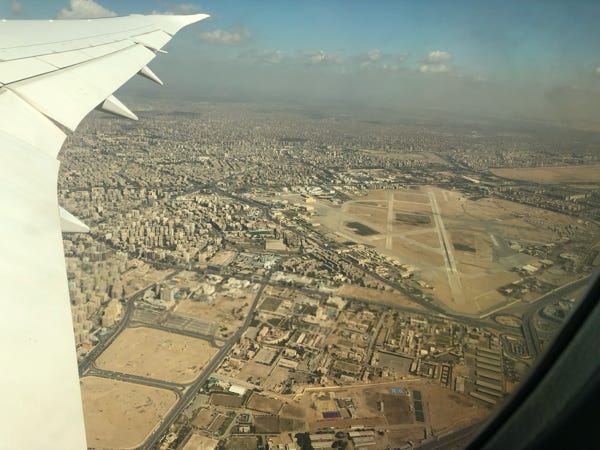 The plane departed around 90 minutes late. Around five hours later we landed at Cairo. Then began a long process of entering the country. At the first check point, we each had to pause in an arch and a sensor checked our body temperature (presumably to ensure that we didn’t have a fever). Our Covid paperwork was checked yet again, and we had to complete and leave behind a contact tracing form.