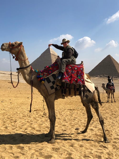 We drove on to a hill above the pyramids. A number of us paid for a short camel ride to a viewpoint, where our camel drivers took photos of us posing. Of course they wanted tips afterwards, but the advised amount was only the equivalent of a pound.
