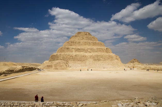 Then we had a choice. We could return to the hotel, or we could pay for an afternoon visiting several more sites, although this would cost £50.00. Most of us opted for the excursion. The skies had mostly cleared but a wind picked up as we drove to Saqqara, the City of the Dead. The archaeological area is vast and we only had time to visit a few sites. One was a rather crumbled pyramid, with the option of going inside. This meant carefully going down a steep ramp, and crouching very low as the passages were half even my height.