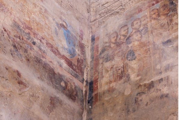 At the top, the camel laid down and dismount was a bit smoother. Our guide led us into the ruins. Not only did we have our usual guard (with his semi-automatic on clear display), we’d picked up a local officer, equally well armed. We were shown the chapel, the cell of the abbot, the baptismal font, and the stables for the animals. The site was due to shut at 4pm, and the local officer kept reminding our guide of that fact.