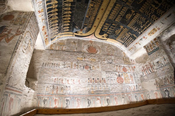 I began with the Ramses III and IV tomb. It was wonderful to go down inside, and the wall decorations were very well preserved. This was also the case with some of the other tombs, though the quality of preservation varied. The ceilings were also heavily decorated. Our guide had explained that the sky was viewed as another sea (as it was blue, same as water), which was why the dead were transported in boats.