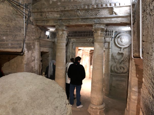 Our first stop was to visit the Kom al-Shoqafa catacombs, built in the second century CE. Cameras were not allowed, so I had to resort to using my iPhone for photos. As we walked towards the entrance, our guide explained that the catacombs had been discovered when a donkey fell down inside. One of our group asked, with some concern, what had happened to the donkey. ‘It was taken to a donkey hospital,’ one told her. Another chipped in, ‘Oh, no, it would have been taken to a donkey sanctuary, surely.’ I intoned, ‘His memory lives on through his children.’