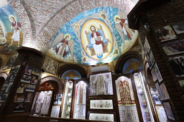 A modern buildings held the tomb of Pope Shenouda III. The large chamber featured painted ceilings and cases which held religious garments. People wrote messages on bits of paper to leave behind.