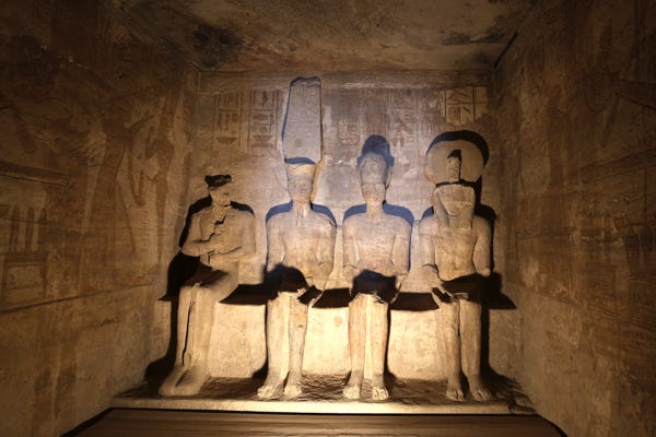Abu Simbel was cut out of the rock during the time of King Ramesses II around 1264 BCE. Of the four statues, one was collapsed centuries ago during an earthquake.