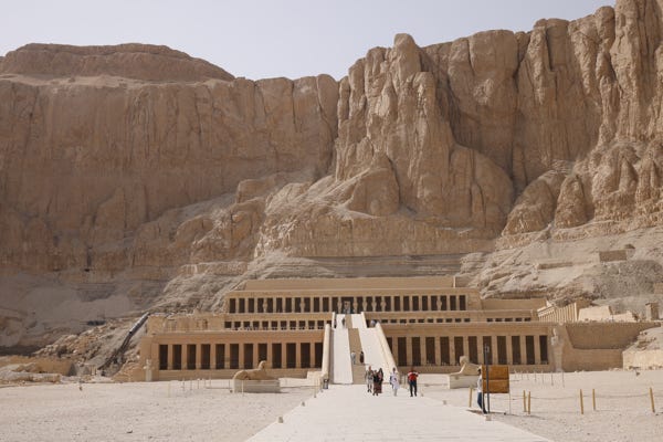 Our last site was Al-Deir Al-Bahari Temple, which contains the Mortuary Temple of Hatshepsut. This female pharoah came to the throne in 1478 BCE. The temple has been extensively reconstructed. Men in the various areas offered to take photos of us, no doubt planning to ask for money afterwards. We declined.