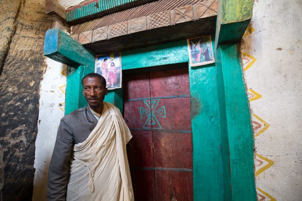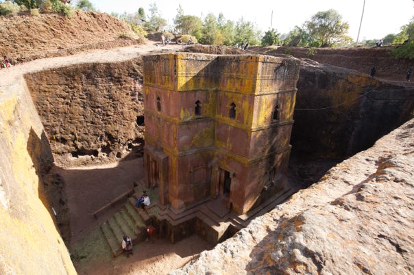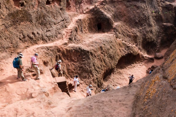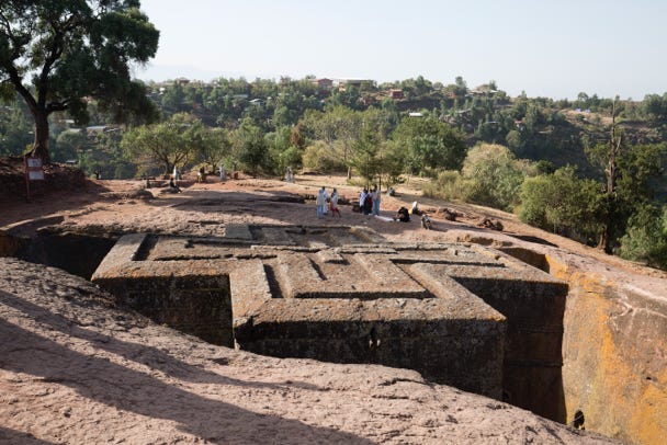 Our first stop was to the extraordinary church of St George. The church is a monolith, carved out of the surrounding rock in the shape of a cross. We stared in awe from above, then went through a narrow sloping gully to visit in from the ground floor. A local woman had been hired as our shoe keeper, so as we took off our shoes to enter (carefully tucking trousers into socks due to the risk of fleas), she gathered our shoes and watched over them. I’m not certain whether this is due to a risk of theft or simply some scheme for local employment.