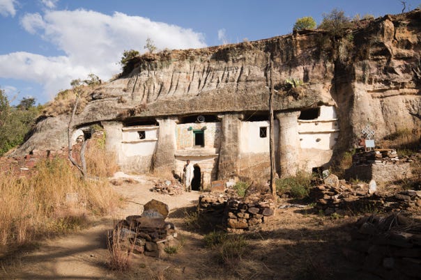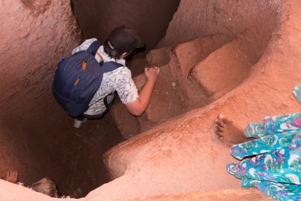 After lunch, we headed down another very bumpy dirt track to the church of Methane-Alem Adi Kesho. We’d had mixed reports about the climb up to the church, one guidebook describing it as ‘steep but easy’. Well, easy perhaps if you have a good head for heights. I had left my backpack behind and packed only one camera and lens. Just as well. The climb was a steep rock face, which did have footholds which were sometimes more dangerous than just the rock itself. Local lads turned out in force to offer their help (the going rate of payment is around 100 Birr, so just over £3.00). I accepted one man’s help quite happily.