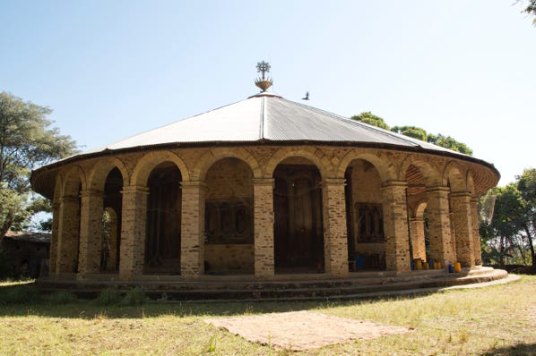 Our first stop was the Narga Selassie Monastery, based on an island. We walked through a stone gatehouse to the small church. A man carrying a rifle hovered in the grounds, offering small replicas of reed boats for the grand price of 100 Birr.