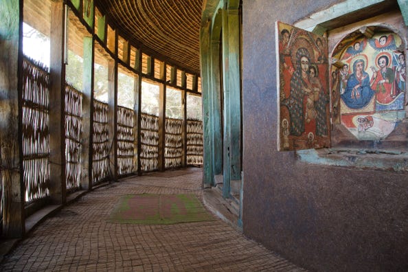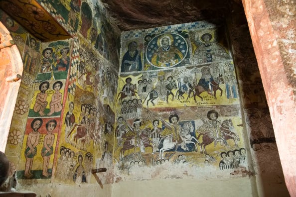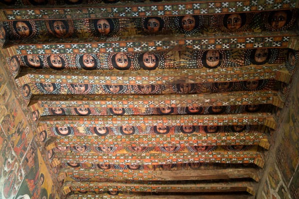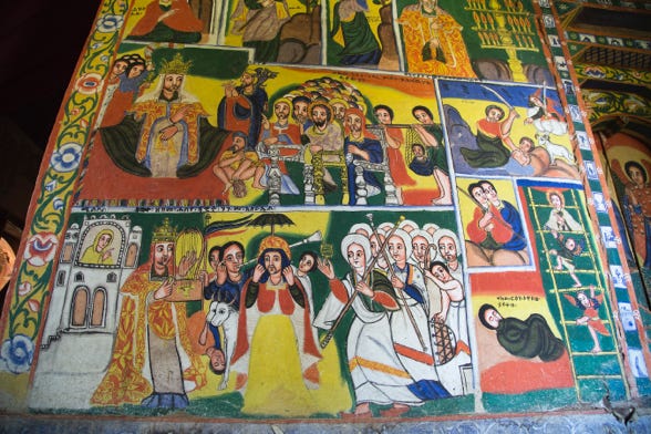 The priest came to join our guide as we went inside to view the paintings. The illustrations were a mixture of biblical stories and those of saints. Gabre explained everything through the lens of the Ethiopian Orthodox tradition, much of which is not in the biblical record. For example, he said that Mary had been raised in the Temple, that Joseph had been her guardian, not her husband. The depictions of the Flight into Egypt showed events along the journey, mostly of people who had either helped or hindered the holy family. All this was rather confusing to some of us, who compared notes as to what was and was not in the Bible.