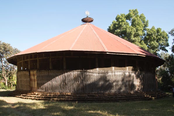 We drove back up the dusty road and to our second church, Wukro Cherkos. This one was far less decorated. Our local guide played the drum for us and the local priest accompanied him on the rattle which they use as a church instrument.