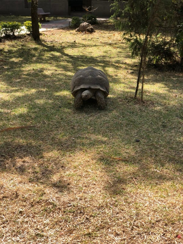We walked up a pathway which smelled of eucalyptus and soil. Birds flitted between the trees. I’m certain the very small ones were some type of flycatchers. But the most wonderful creatures were near the mausoleum itself. Giant tortoises, native to the country, who have take up residence in the grounds. I snuck a quick photo with my iPhone.