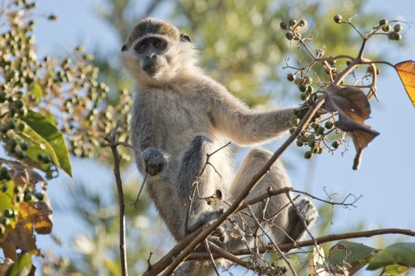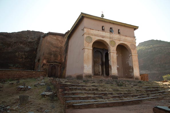 We headed back across the lake, calling in to URA Kidane Mehret monastery about two hours later. This one is much more visited, as was evident by the large number of stalls set up to sell souvenirs. The owners were quite persistent at trying to sell their offerings of scarves, coffee, silver crosses, and paintings. I ignored them on the way up, but was distracted by a troop of Vervet monkeys.