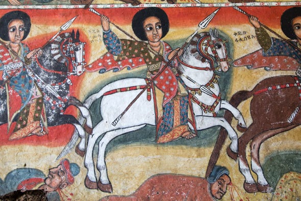 The church was similar to the previous one. The walls had been built out of mud and straw on a brick base. The paintings were of a similar style, but had some new stories to offer us. I enjoyed the one of saints on horses, symbolically destroying the older, pagan religions under their mounts’ hooves. Another painting depicted the Council of Nicea, and Arian as suffering digestive difficulties for daring to preach his heresy.