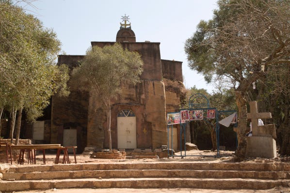 A shorter day. We headed down a very bumpy road to the first of two churches, Abreha Wo Atsebeha. Children surrounded us as we exited the mini bus, offering small shell fossils for sale. They didn’t follow us through the gates which led to the climb up to the church. We paused to catch breath and admire the views before going up to the church proper. As ever, we left our shoes outside.