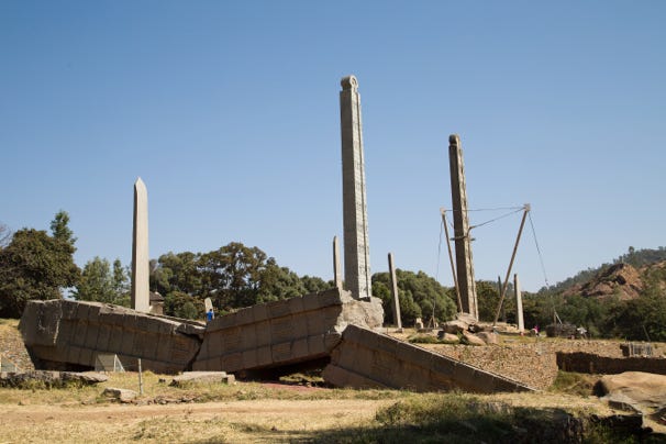 A few decades ago, a farmer came across a tall stone slab which has been nicknamed ‘The Rosetta Stone of Ethiopia’. The engravings are in three languages, including Greek, and boast of the military exploits of King Ezana. He ruled from 330 to 356 AD. The slab is taller than a human being, and has been stood upright where it was found. A shelter now protects it from the elements.