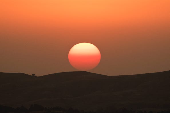 We headed back down the gravel road to town. The driver allowed us a brief stop to photograph the setting sun. I’d never seen the sun blocked so much by dust so that it appeared as a red orb.