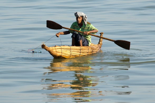 Both birds and fishermen were active in the early light. Cormorants landed alongside the boat at regular intervals—it seems that fish are stirred up by a boat’s passage. Fishermen were out in small boats constructed out of reeds, and most of them had one or two pelicans in attendance. Most of the fishermen were at a distance, but we did pass quite near one man, who looked unimpressed by the experience.