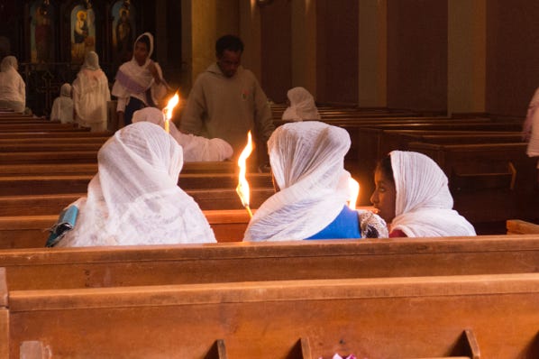 We emerged back to fresh air. A couple of tortoises were slouching around the entrance gates. We boarded the mini bus, and went to our next stop, the Holy Trinity Church. Today, we were told, was Trinity Day. A number of people were visiting the church to pray, holding up lit objects which were more like tapers than candles. Many of the women, in particular, wore white shawls which they draped over their heads and across their backs.
