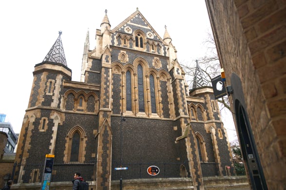 The remains of Winchester Palace stood further down the street. The Palace was the London residence of the Bishops of Winchester from 1150 to the mid-17th century. Part of the foundations and the west wall, with its 14th century rose window, remain.
