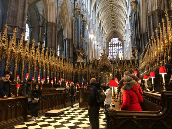 An earlier start to the day. We left the hostel at 9am and made our way by underground and on foot to Westminster Abbey to attend the 10am service of mattins (morning prayer). By 9.40am we entered the Abbey, so we went to the ladies for quick comfort break. I finished what I needed to do before my friend, so I went back outside to admire the views from the cloisters. A security guard came up to challenge me. ‘Are you here for the service? We don’t allow people to look around and take photos.’ I responded, ‘I am here for martins, I’m just waiting for my friend to finish in the loo.’ Rather than be challenged again, I went back into the ladies to wait for my friend to finish.