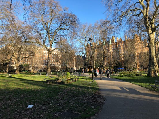 We stopped for a coffee at an Italian cafe in Russell Square Gardens before carrying on. St George’s Gardens. The ground was frozen underfoot as we admired some of the old graves. Anna Gibson, Oliver Cromwell’s granddaughter, was laid to rest in one of the tombs.