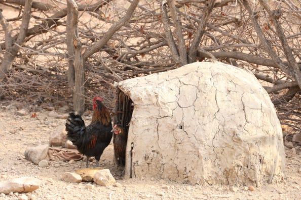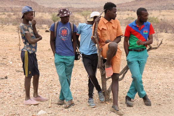 At 4pm we gathered for an afternoon excursion. We saw four Rüppell'sparrots, not great for photos but lovely to see them. A hornbill grumped nearby. We visited a small village encampment, which had mud huts, an animal enclosure, and three women. A different interpreter had gone with us, and we were able to ask more questions of the Himba through her. We also discovered that we Western women were not good marriage candidates, as we didn’t know how to slaughter a goat.