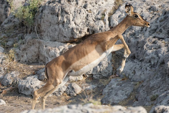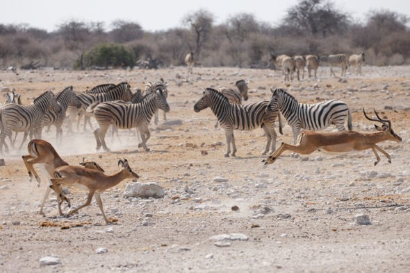 Our last stop was another watering hole. Something alarmed the animals several times, causing the zebra to gallop off and the various antelope species to spring away. We never saw the cause of the panic ourselves.