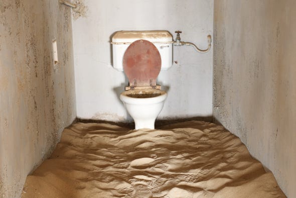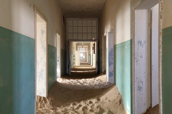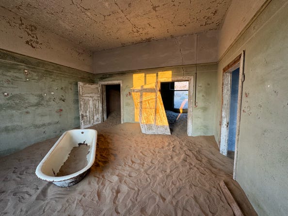 The sand in many buildings is now waist high, so you enter through windows rather than doors. As the sun rose, light streamed into the rooms, highlighting the sand and the decaying walls. Bathtubs can be found in various rooms, and it seems the site staff move them from place to place.