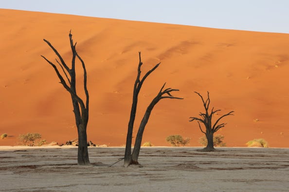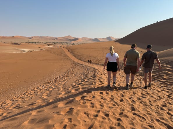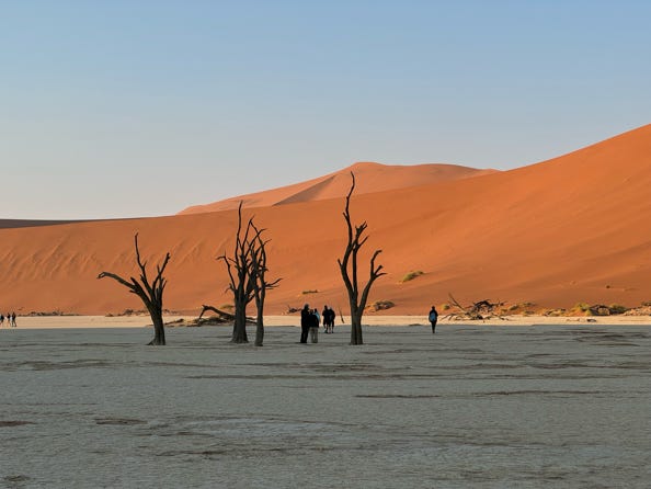 Deadvlei features a set of trees which had once been rooted in a lake. The lake disappeared, leaving a white salt flat, and the area is so dry that the dead trees have not decomposed. It’s thought that these ancient remains are over a thousand years old. Our guide drove past the main car park and took us cross country, eventually arriving at the main path to Deadvlei. The night before he had said ‘It’s only a kilometre, it’ll only take twenty minutes.’ He had not told us that we’d be walking up sand dunes which, although not very steep, still made for hard going.