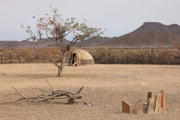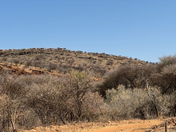 We left vegetation behind for a time, returning to landscapes of mostly barren desert, before once again arriving in an area with trees and bushes. One last grinding through sand and stone brought us up to the ridge on which our latest lodge was located. This was run by the Himba community to benefit the local people.