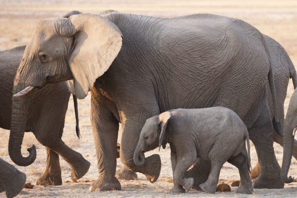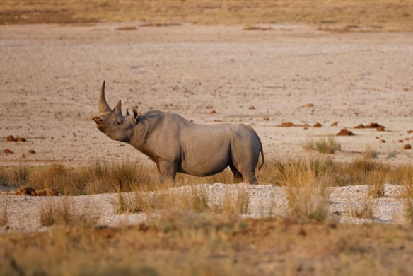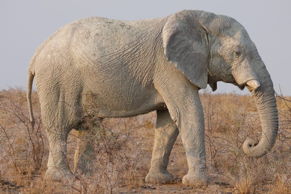 4.30pm we went back out into the park. The clouds had cleared and we had lovely evening light. We admired antelope, ostriches, and a distant herd of wildebeest crossing the salt pan. We found another rhino, with horns, partially hidden by a bank. We also saw several of the ‘ghost elephants’, looking nearly white from the mud they’d placed on their bodies.