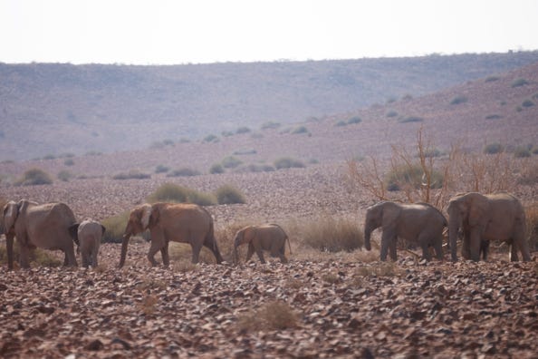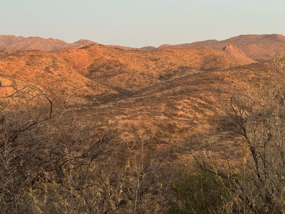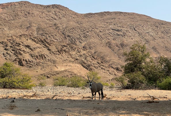At 9am we headed to our next destination. This took around three hours, as we left tarmac behind and drove more slowly on gravel roads. The land was mostly flat, very dry, with occasional stony hills. We saw various birds and a couple of oryx. The group talked, dozed, and sometimes took photos through the windows.