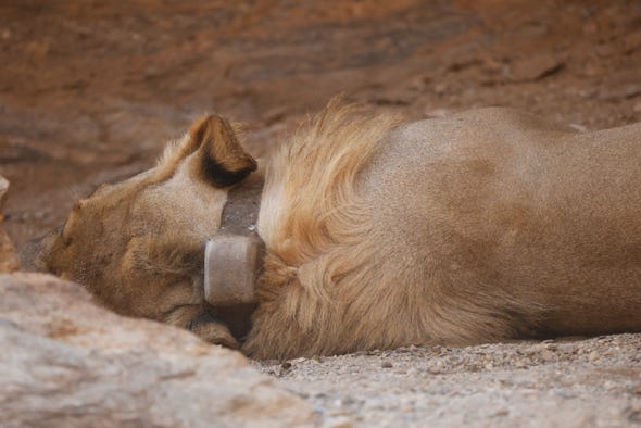 We found the giraffe remains. As our guide tried to reposition our vehicle for a better view of the body, we spotted another safari vehicle nearby. As we joined it, our hopes were realised. The young male lion who had pulled down the giraffe was resting under a rocky outcropping. His head was up as we approached, giving us opportunity for some nice photos. Then he laid back down to return to his snooze. He had a collar on, and our guide explained that this carried a tracking device. Not only could the park’s rangers find him, they can also warn villagers if a lion is heading their way.