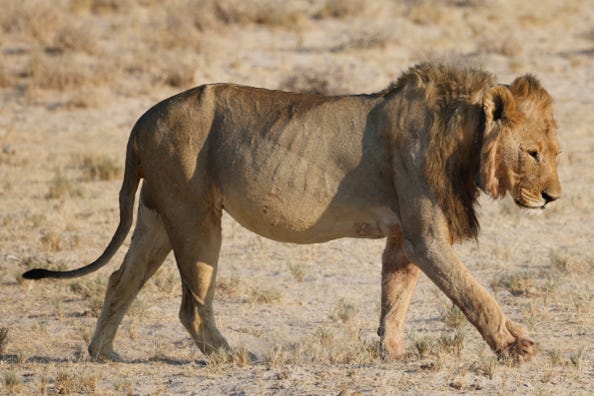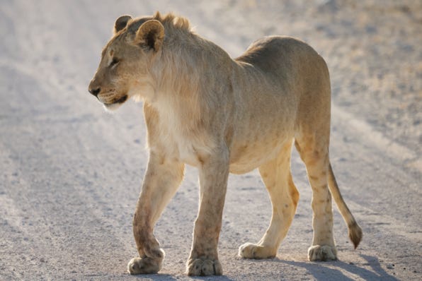Shortly after spotting a hyena in the distance and some oryx, we encountered a pride of lions walking towards us. The lionesses were in the front, followed by an elderly male and a young male. We took photos of them approaching, leaving, and then moved Dusty several times to follow them. The lionesses were in a good mood, several times breaking into play wrestling. One chased the other, biting the base of her tail.