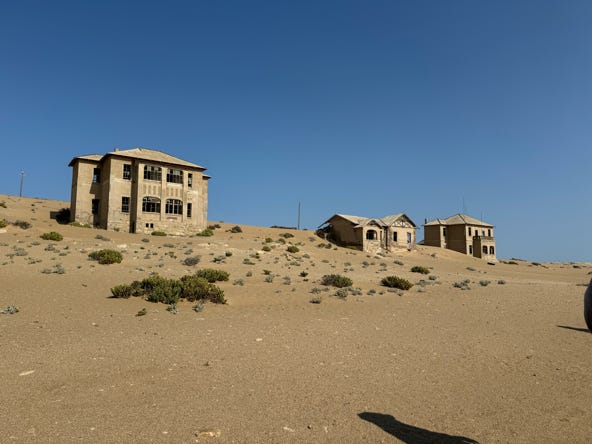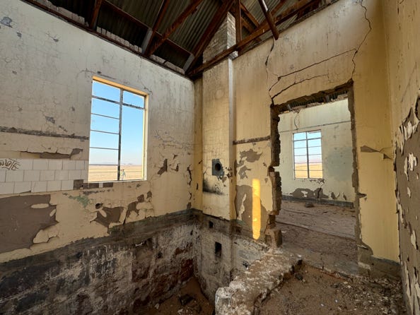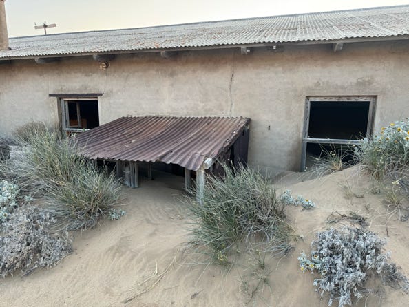 We stumbled into the pre-dawn light for the hour’s drive to Kolmanskop. The town grew during the diamond rush in 1912 and was slowly abandoned, with the last inhabitants moving out in 1956. In its heyday over 1300 people lived and worked in the area. A hospital with a hundred beds and two resident doctors was built, along with a primary school. The buildings are slowly filling with sand and the bright painted walls have faded away into pastels.