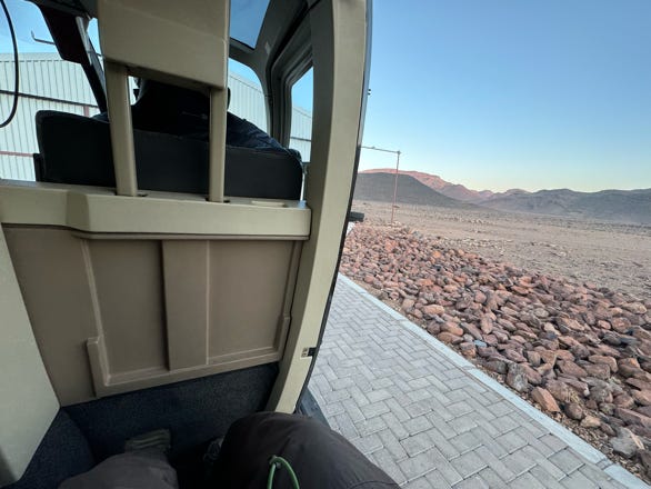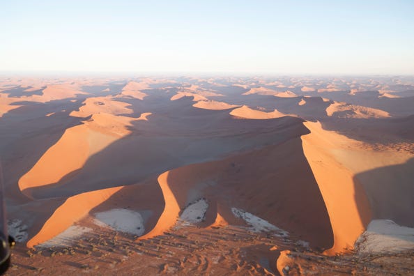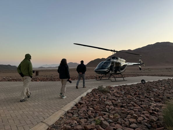 The helicopter took us over the Sossusvlei desert. Mountains gave way to red sand dunes, snaking their way down to dry river beds. I found the lack of doors and the non-stop wind very disconcerting, as well as a lack of anything to hold on to. I must admit, for some time I did not find myself enjoying the ride, although I did take photos. Then I discovered that the lap belt in the empty middle seat was available for my left hand to grab, and that gave me greater confidence for when the pilot turned the helicopter.
