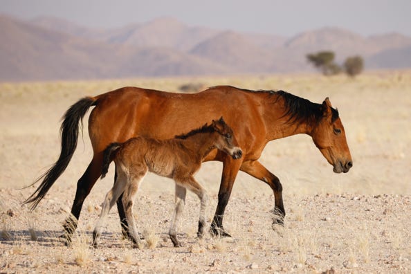 At a waterhole which usually brings in the feral horses had a distinct lack of them. The herd was in the far distance. So we headed off again, and found a small group of what we thought were only four horses. We photographed the stallion to start with, before heading closer to the other three. To our delight, there was a foal in the herd, probably around a month old. We had been approaching the horses cautiously, not wishing to scare them. One of the mares decided to come to us and made friends with a member of the group, ironically one who had no experience with horses.