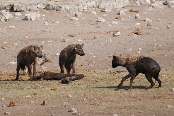 We returned to the watering hole which had featured the out of sight corpse. The smell was even worse than the day before whenever the wind shifted direction and wafted the putrid scent over eyes and noses. But the action made it worthwhile. Hyenas had dragged portions of the carcass from behind the reeds, and were busily chewing away. Jackals made attempts to take bites for themselves. A long leg identified the deceased as giraffe.