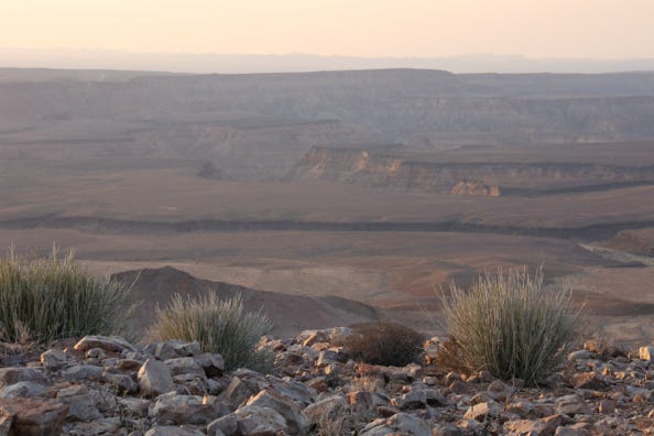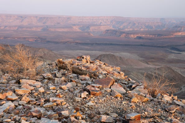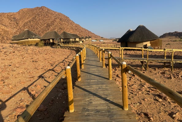 We arrived at the Fish River Lodge in time for lunch. I had chicken mayonnaise with salad. Afterwards we checked into our chalets, which overlooked the Fish River Canyon. The canyon is the second largest in the world. As the light was harsh, and the wind had picked up, I stayed in the room and worked on photos. Two showers were on offer, one indoors, one out. My roommate tried the outdoor shower and found that it had no hot water. I thanked her for taking one for the team and opted for the indoor shower, which did provide hot water. I shared said shower with a four-legged cricket whom I named ‘Quad.’