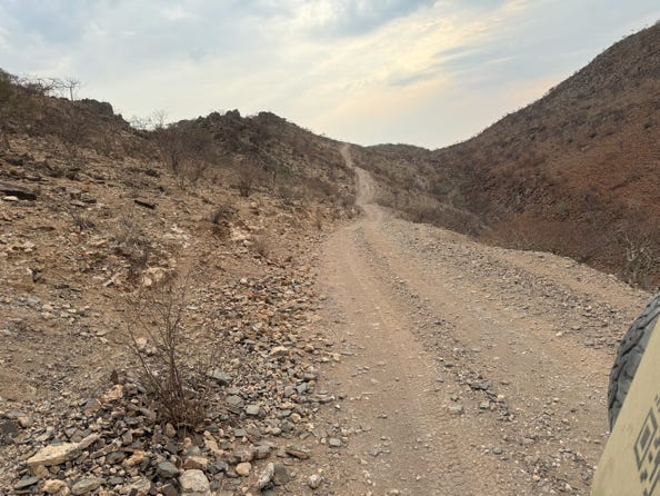 As warned, it was a long day’s drive. We not only left marked gravel roads, at time I wondered how our guide knew where to drive. At times we bounced, ground up sandy passages, and were given great views over rather dramatic drops.