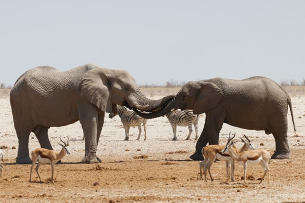 A large bull elephant trumpeted as he took over prime position at the water, the other animals quickly giving way to him. A smaller male joined him, and the two entwined trunks before drinking side by side. A third bull approached, and was given far less welcome.