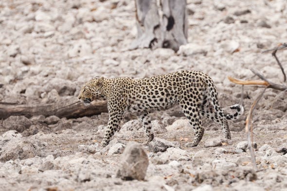 The park is supposed to shut at sunset, so our guide began to hurry us back to the lodge. Dusty was brought to a juddering halt as he suddenly saw the same leopard as we’d watched in the morning. She crossed the road and loped away.