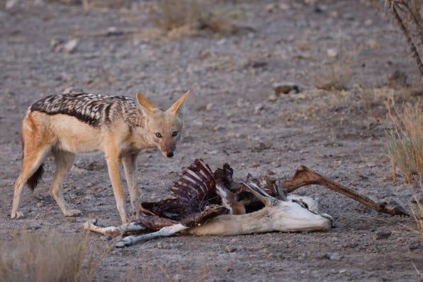 Afterwards we came across the carcass of the springbok which the lions had killed. The remains were spread across a wide area, and jackals and crows were tearing into the meat and bones. Two jackals had a fight over one leg.